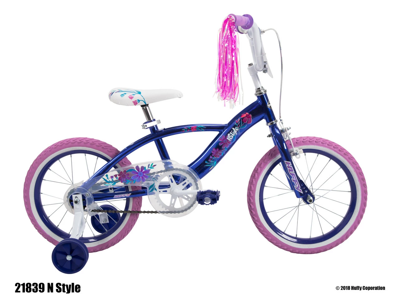 Huffy 16 inch N’ Style bike will have heads turning when they see the super high -gloss Metalloid midnight blue coating which delivers maximum shine for a fantastic look. The N ‘Style bike features cotton-candy colour tires and shimmering streamers! Front handbrake and rear coaster brake provides a great combination and value. The handlebar and saddle easily adjust for a perfect fit! Huffy, We Make Fun!