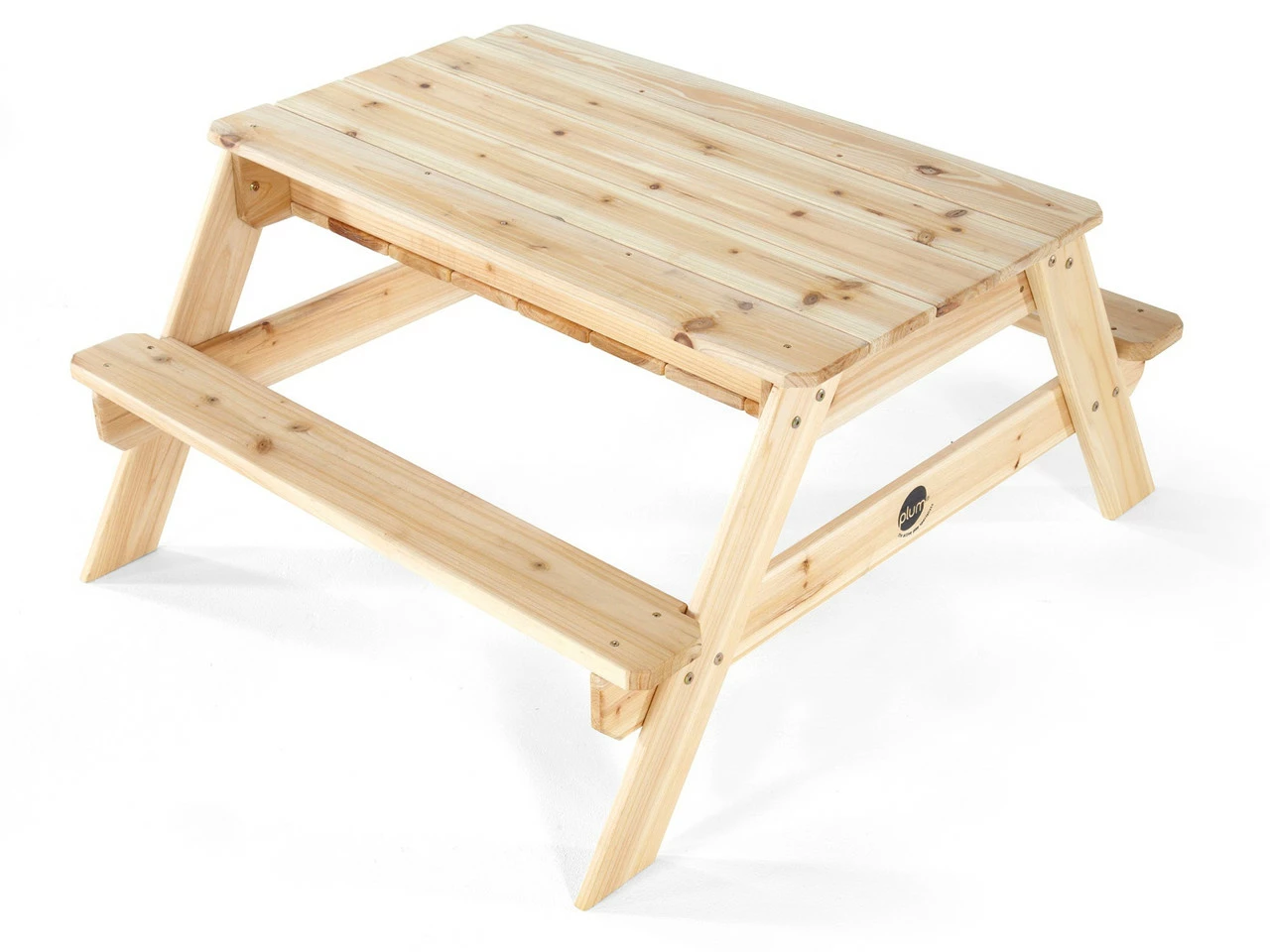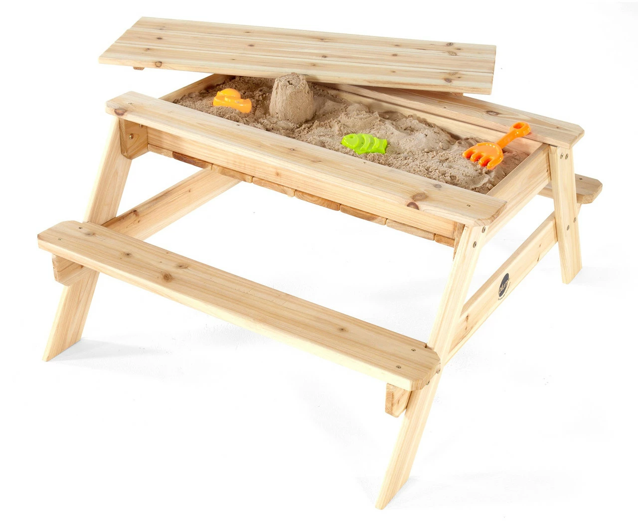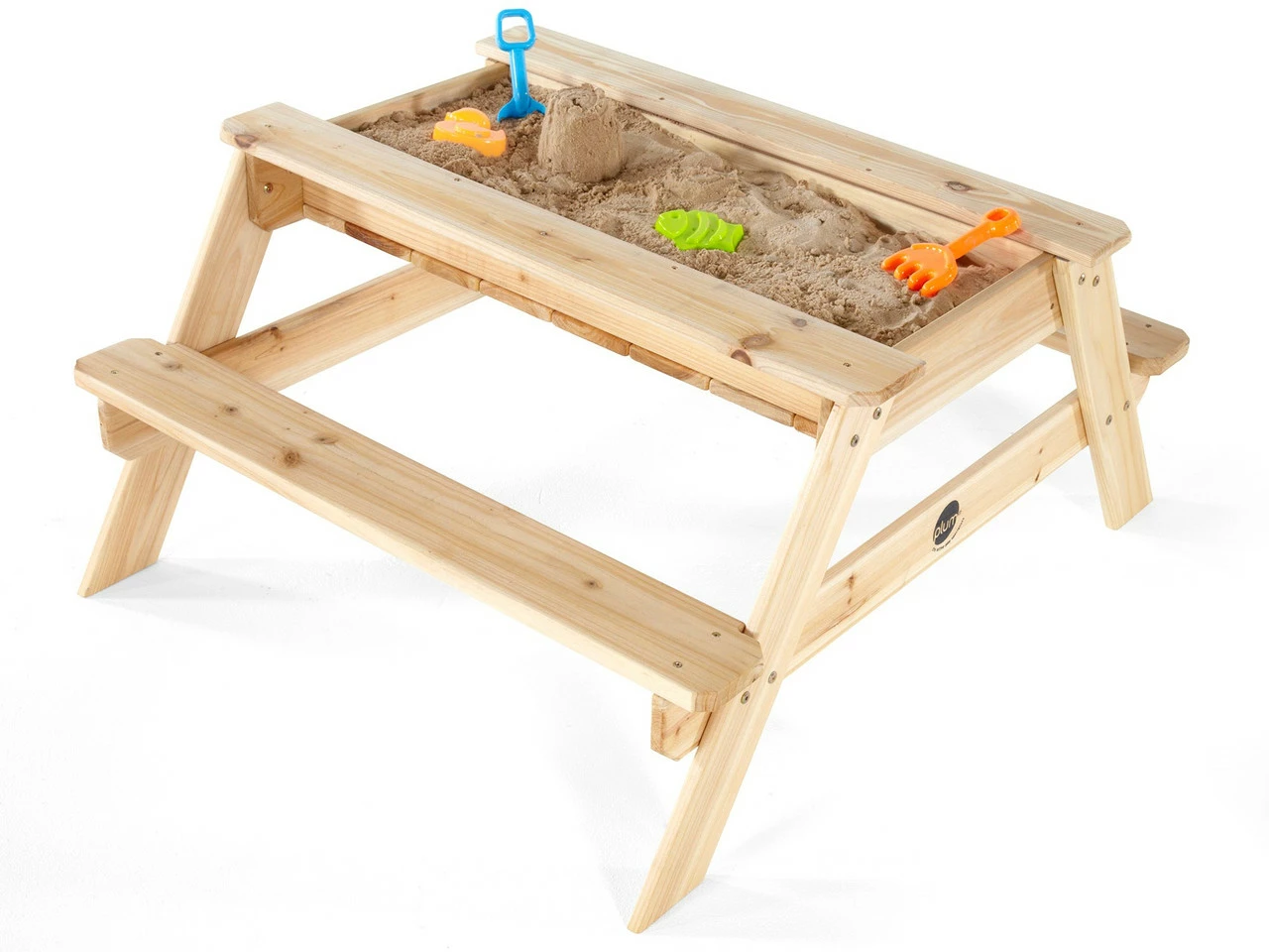The Plum® Wooden Sand and Picnic Table is a space-saving activity table combining outdoor dining with sensory sand play.