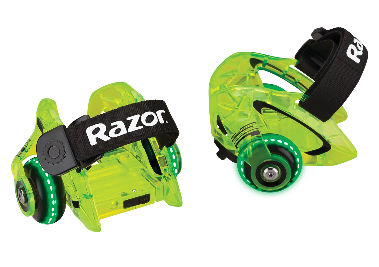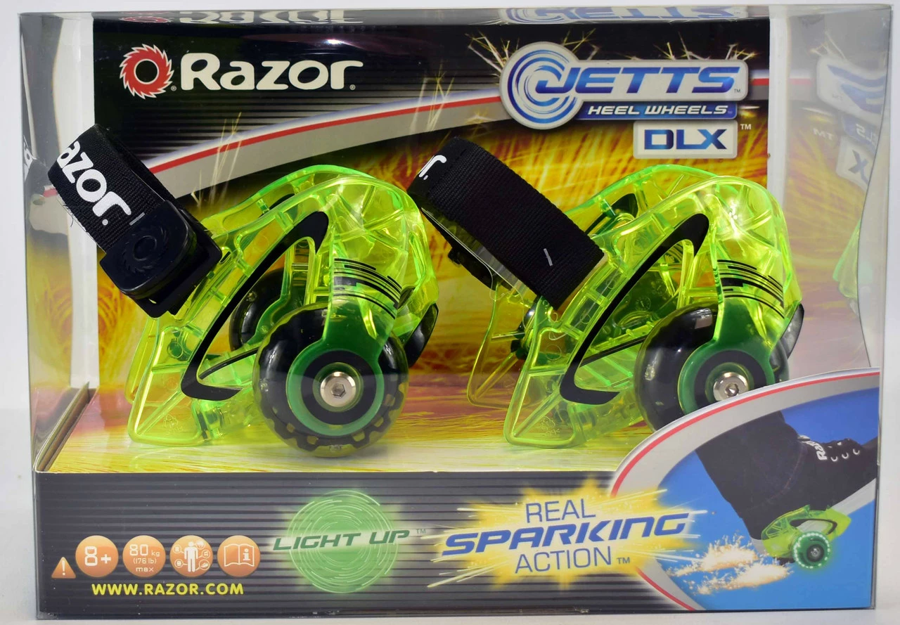 Put your sneakers into warp drive with the Razor Jetts DLX heel wheels. The glowing, LED wheels and translucent, polycarbonate frame will take you to another dimension of fun, with an extra burst of flashing sparks when you really want to light it up. Featuring our quick click hook-and-loop strap, the Jetts DLX will have you ready to blast off in a flash.