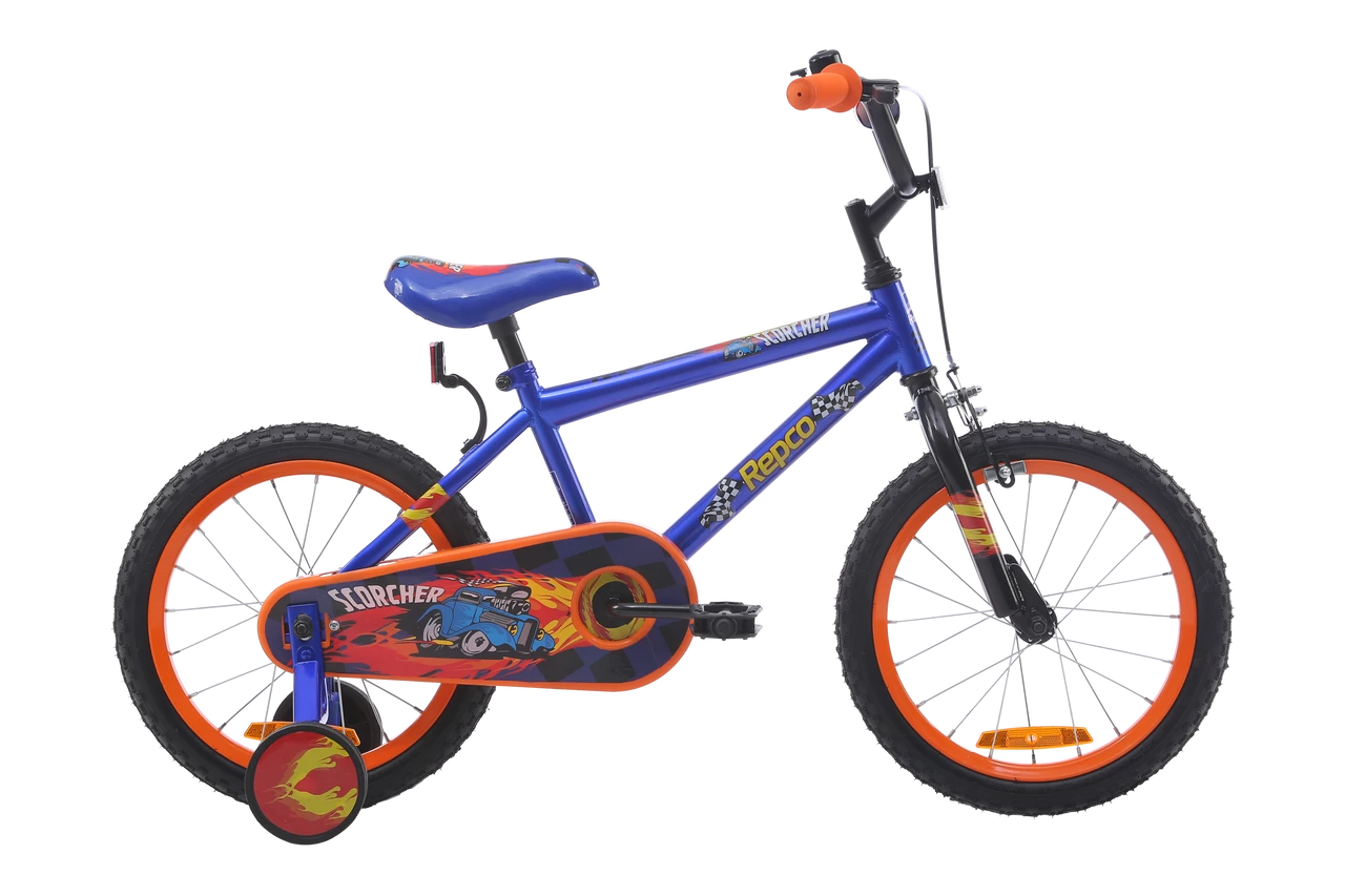 The Repco Showdown/Scorcher features a sturdy steel frame and BMX fork, an easy to use back pedal brake and a front hand brake for extra braking. Also equipped with a fully enclosed chainguard and handlebar pad for safety, plus removable training wheels to assist the process of learning to ride.